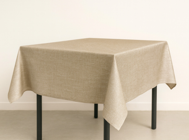 Het kersttafelzeil met linnenstructuur combineert een warme zandkleur met subtiel zilver. De afwerking geeft jouw tafel een elegante winterlook zonder te overheersen. Dankzij de beschermende PVC-coating is het zeil afwasbaar met een natte doek, niet uitwasbaar, en ideaal voor dagelijks gebruik tijdens de feestperiode.