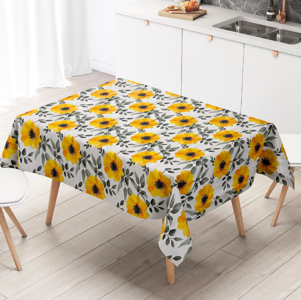 Tafelzeil model bedrukt met grote oranje bloemen.