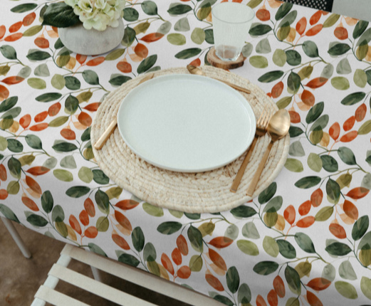 De subtiele bladerenprint in groen, bruin en terracotta brengt een warme, aardse sfeer aan tafel die perfect past bij zowel moderne als landelijke interieurs.