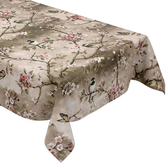 Tafelzeil - Vogels/bloesem taupeDit tafelzeil valt soepel over uw tafel, en is makkelijk schoon te houden met een vochtige doek. Wij adviseren een overhang van +/- 20 centimeter per zijde voor een net resultaat.
